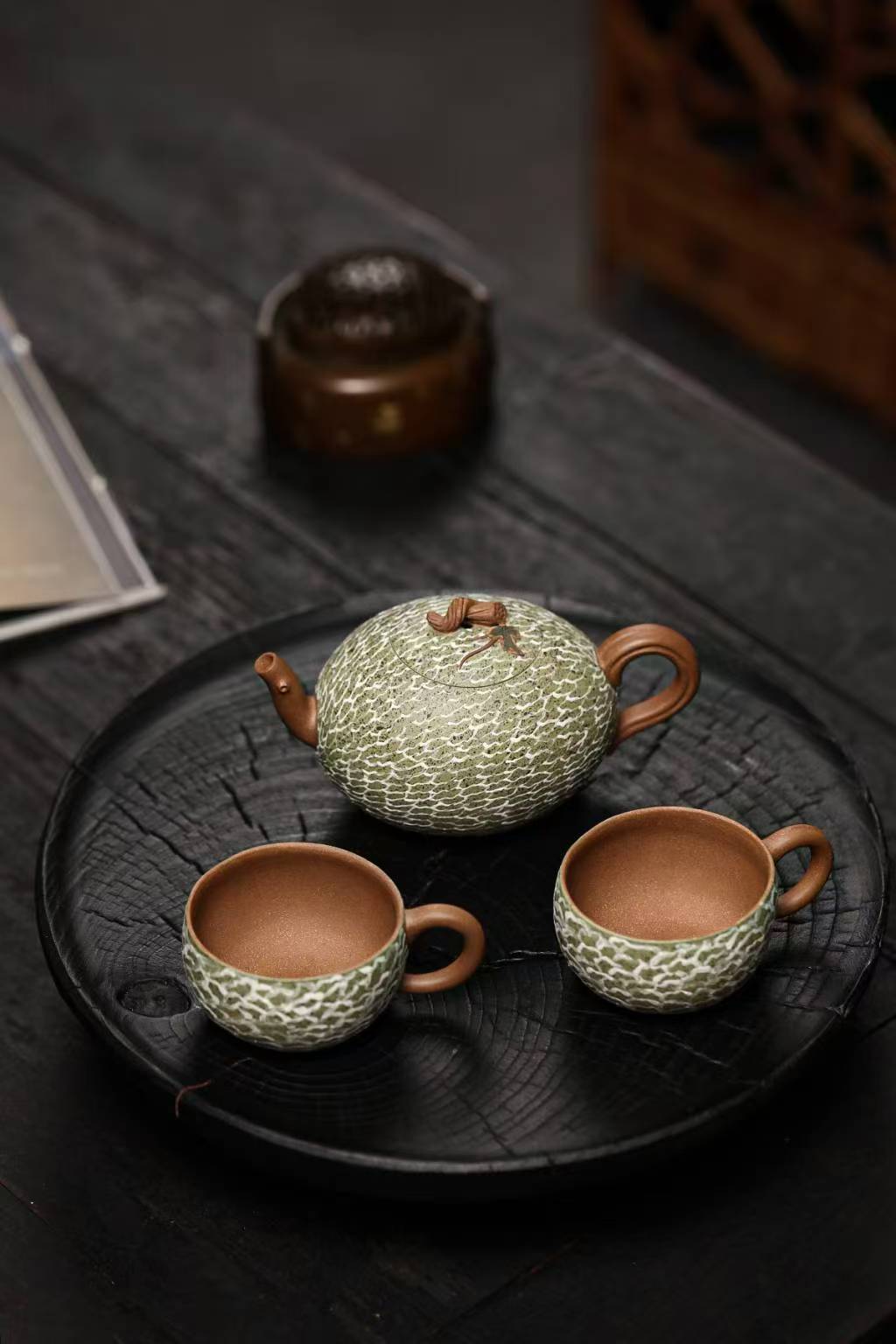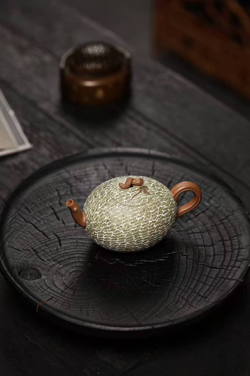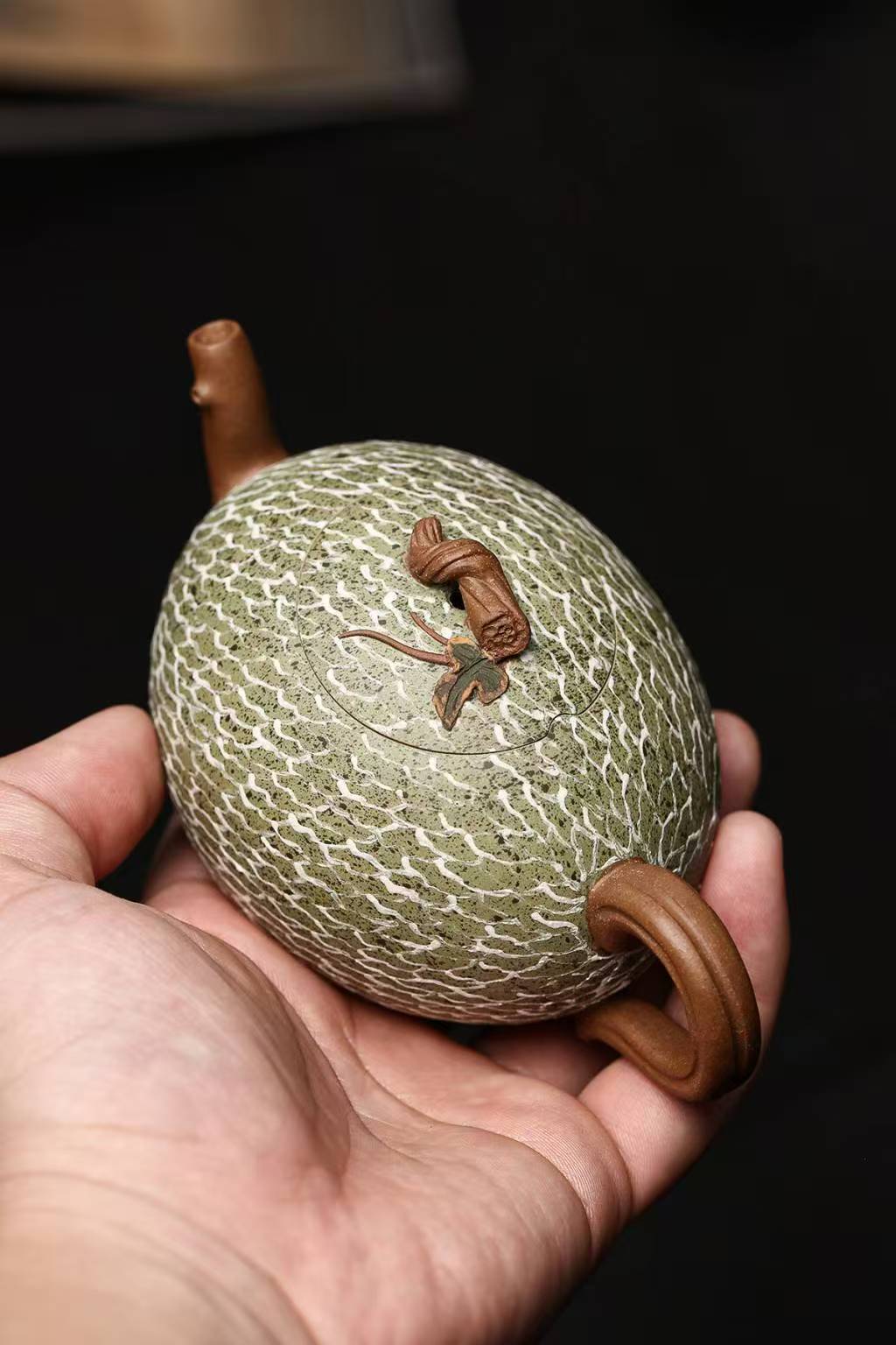 This pottery features a Hami melon grown in Xinjiang. The melon's branches, vines, and leaves serve as the handle, and the body is adorned with different colored Duan Clay. The three-dimensional modeling technique is meticulously detailed and lifelike. The Hami melon's rough skin and tender branches and leaves radiate a vibrant vitality amidst nature, creating a vibrant pastoral melody. This small pot is both a true reflection of nature's creations and a masterpiece of the artist's creative talent.